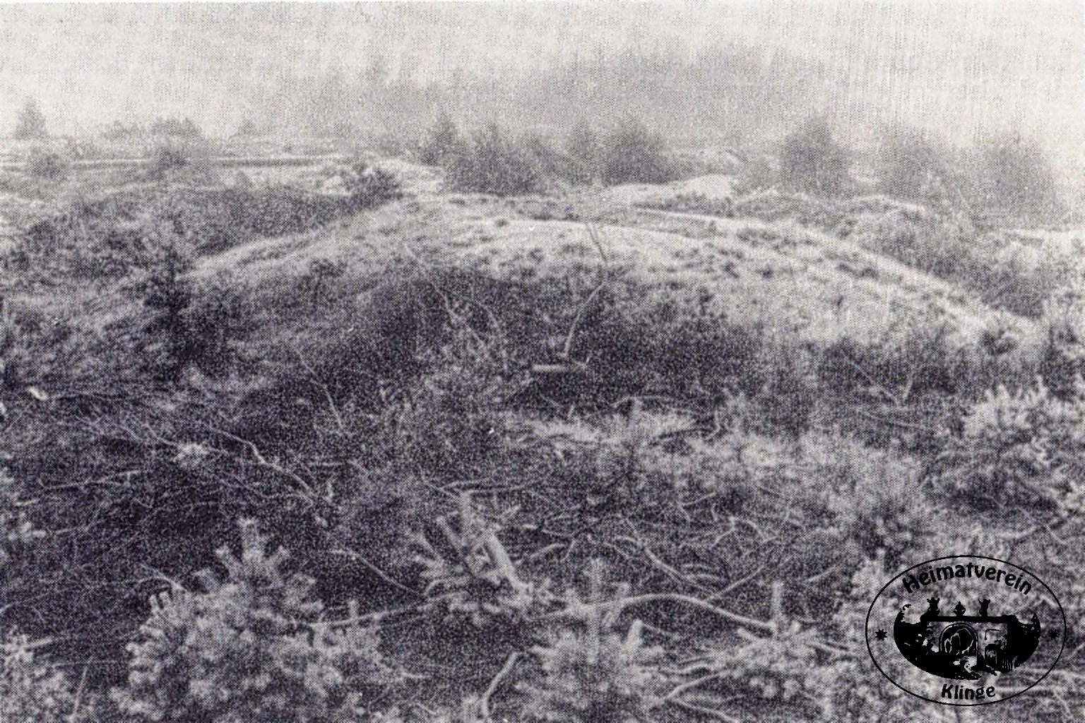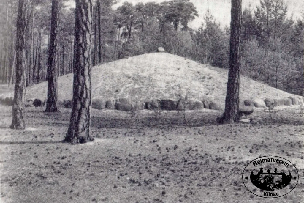 In der Gemarkung Klinge lag 1,8km NNW der Kirche unmittelbar an der Gemarkungsgrenze zu Weißagk ein Hügel- und Flachgräberfeld. Im Herbst des Jahres 1938 wurden laut Fundmeldung beim Stubben roden von Waldarbeitern Gräber entdeckt und gemeldet. In den Jahren 1939-41 wurde unter Leitung von F. Kilian im Süd-Ost-Teil des Gräberfeldes eine Ausgrabung vorgenommen. Zwei Grabhügel der bronzezeitlichen Lausitzer Kultur wurden vollständig ausgegraben und weitere zehn Grabhügel durch Nord-Süd-Suchschnitte sondiert.