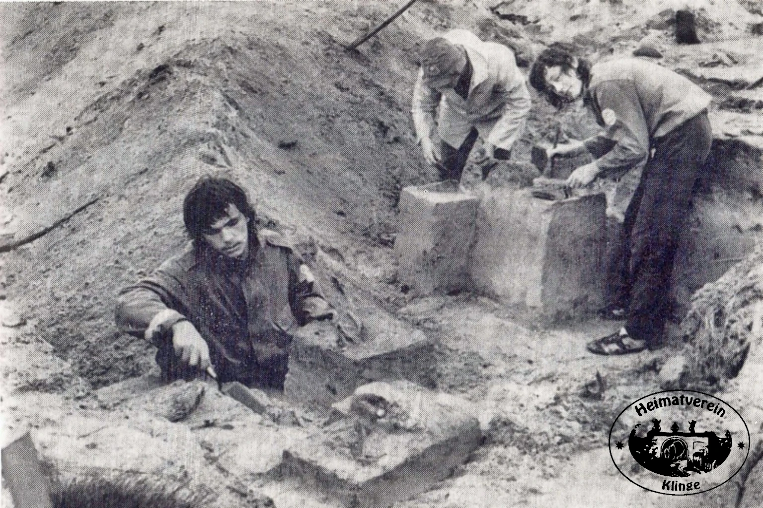 Die umfangreichen archäologischen Rettungsarbeiten im Bereich des Tagebaus fanden seit 1977 im Raum Klinge unter Leitung von R. Probst statt, und mussten im Jahr 1982 wegen der vollständigen Devastierung der Gemeinde schnellstens zu Ende kommen. Bei dieser Grabungskampange wurden 6.200m² des Fundplatzes untersucht. Es wurden acht Grabhügel vollständig sowie drei Grabhügel zum Teil und 259 Flachgräber, 71 Grubenverfärbungen, ferner 16 Feuerstellen neben diversen Scherbenstellen ausgegraben.